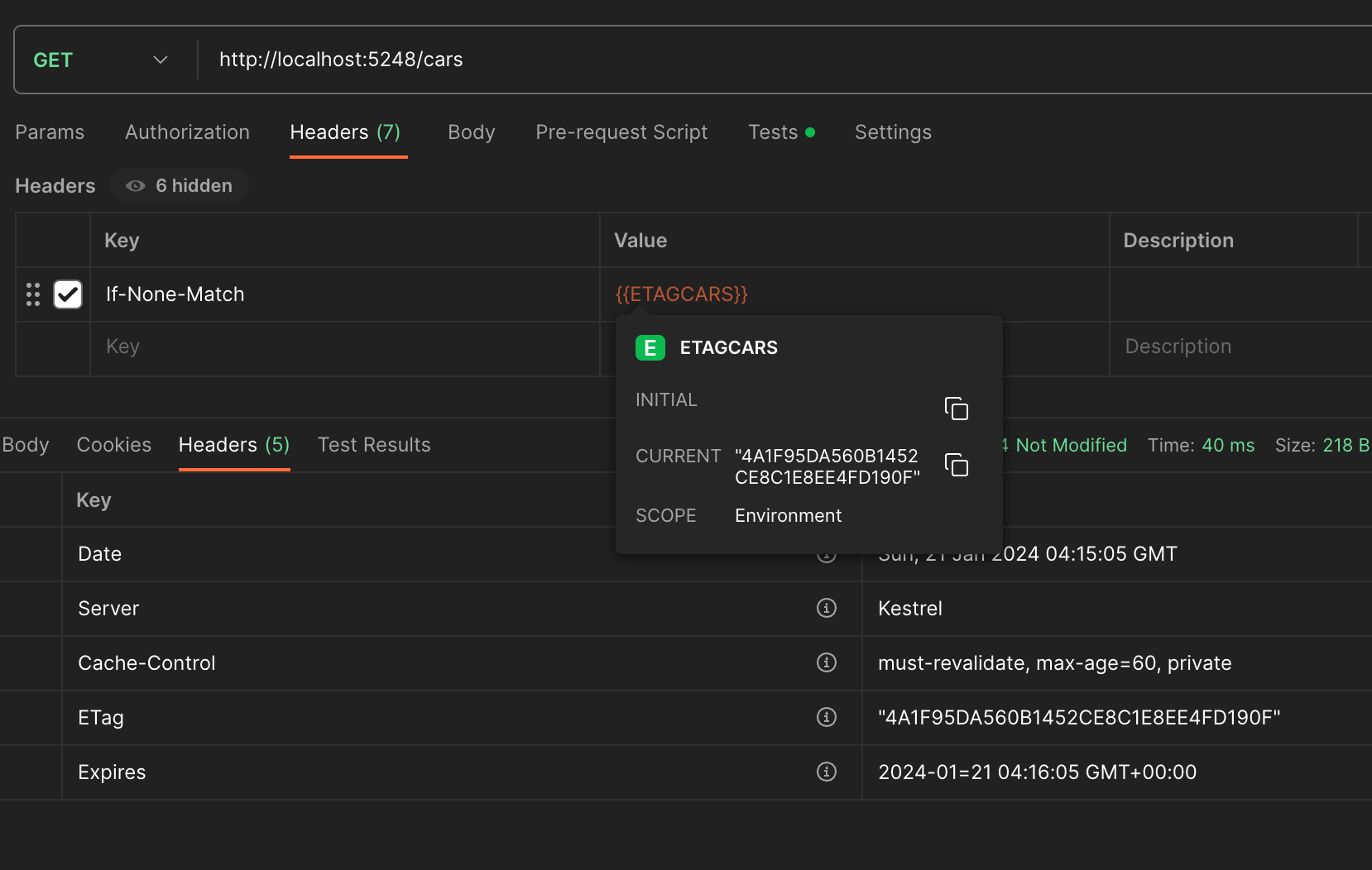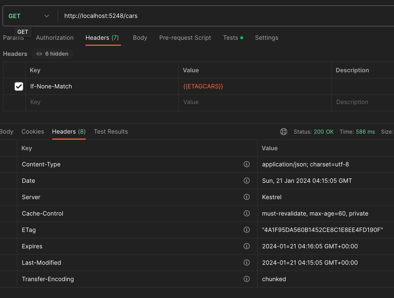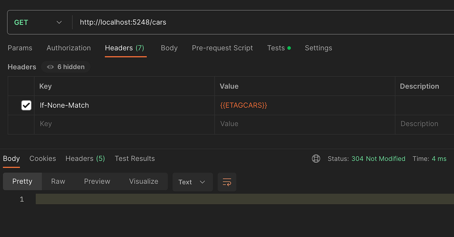 [ResponseCache(CacheProfileName = ResponseCacheProfiles.CARS)]If the output cache needs to be deleted, dependency injection can be used to pass the IOuputCacheStore (in this case it would be the stack exchange redis configured) and evict the by tag (also configured in the custom policy created earlier)